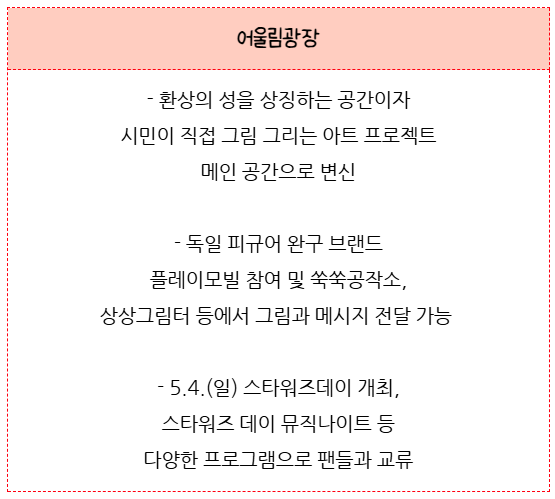 간단히 정리해보면 환상의 성처럼 꾸며진 어울림광장부터 가족 체험존, 감성적인 야외 공연, 그리고 미래를 체험할 수 있는 전시까지!