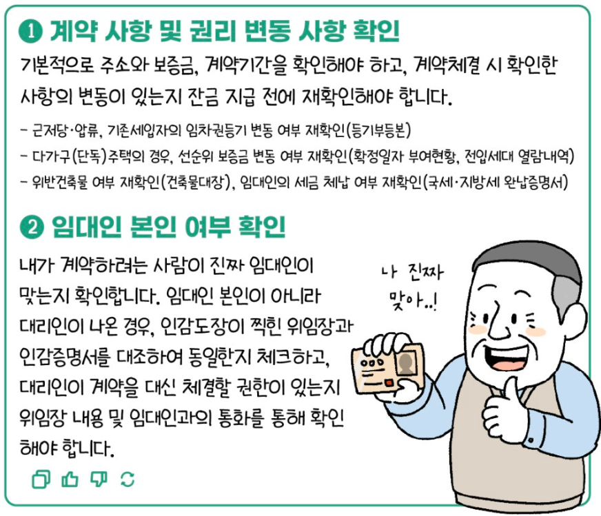 - 등기부등본 재확인, 임대인 검증, 특약사항 명시