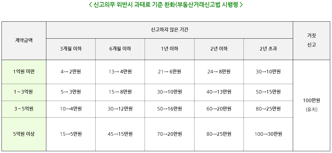 예: 1억원 미만 계약의 3개월 이상 지연신고는 6만원 → 2만원으로 줄어듭니다.