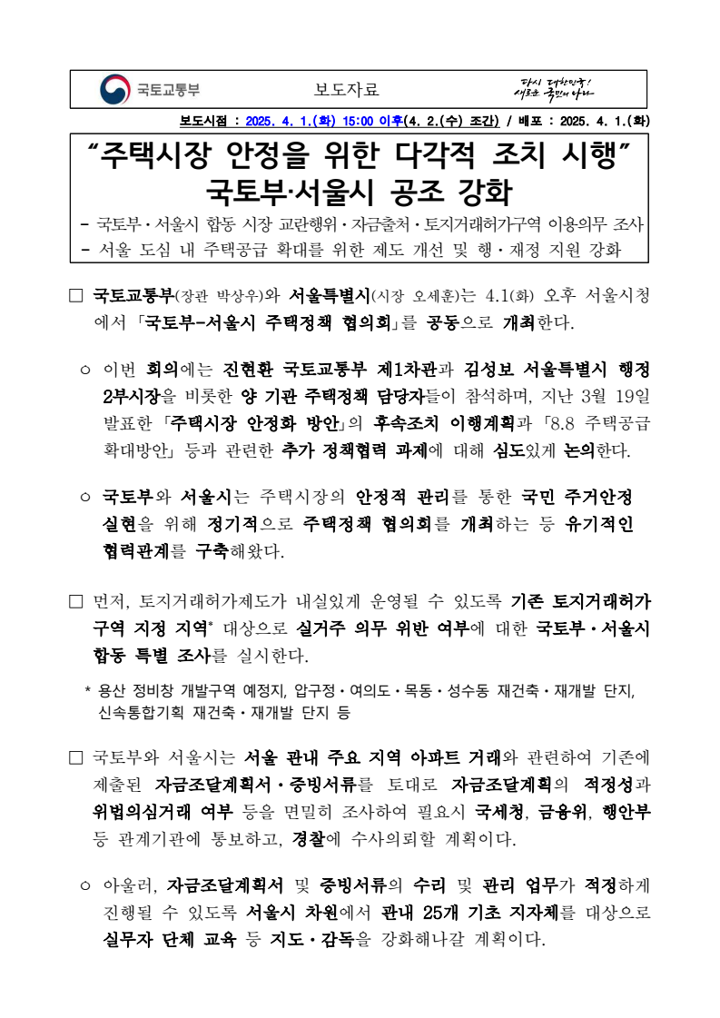 안녕하세요! 오늘은 국토교통부와 서울시가 공동으로 추진하는 주택시장 안정화 정책에 대해 알아보려고 해요 🏘️