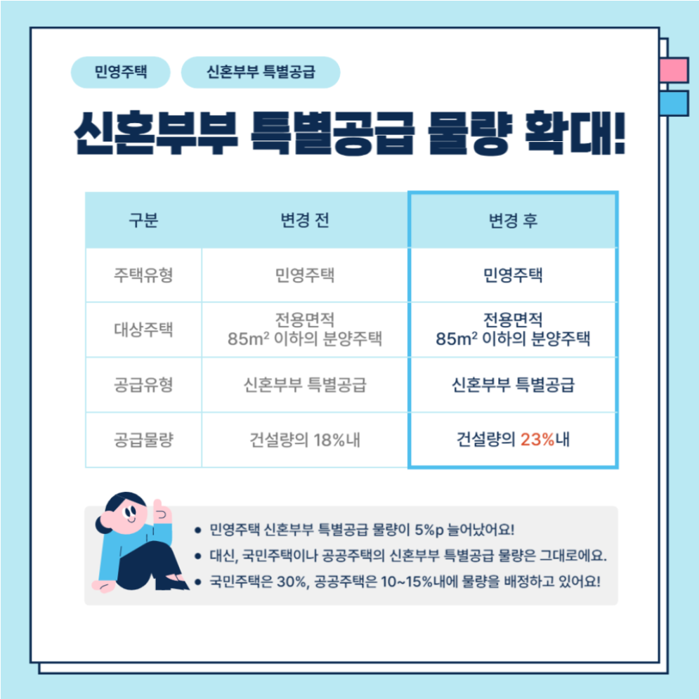 2025년부터 민영주택에서 신혼특공 비율이 18% → 23%로 올라간다고 해요!
