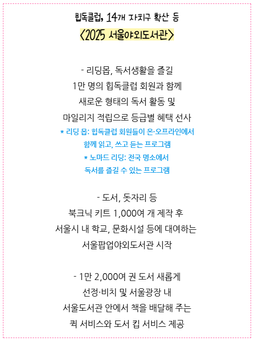 지금까지 힙하게 돌아온 2025 서울야외도서관에 대해 알아보았는데요.
